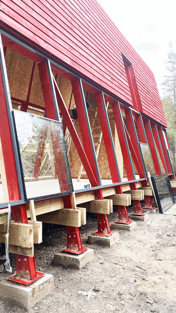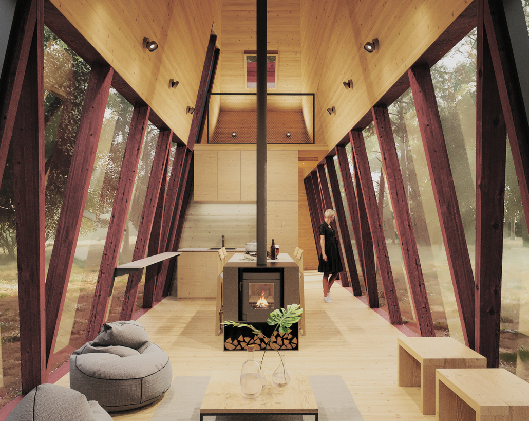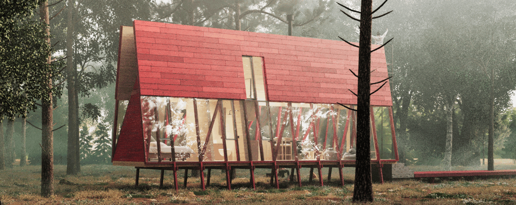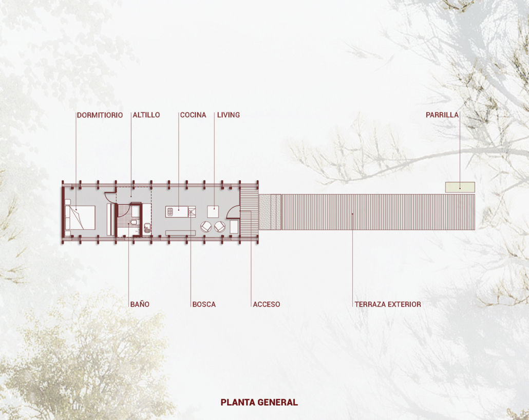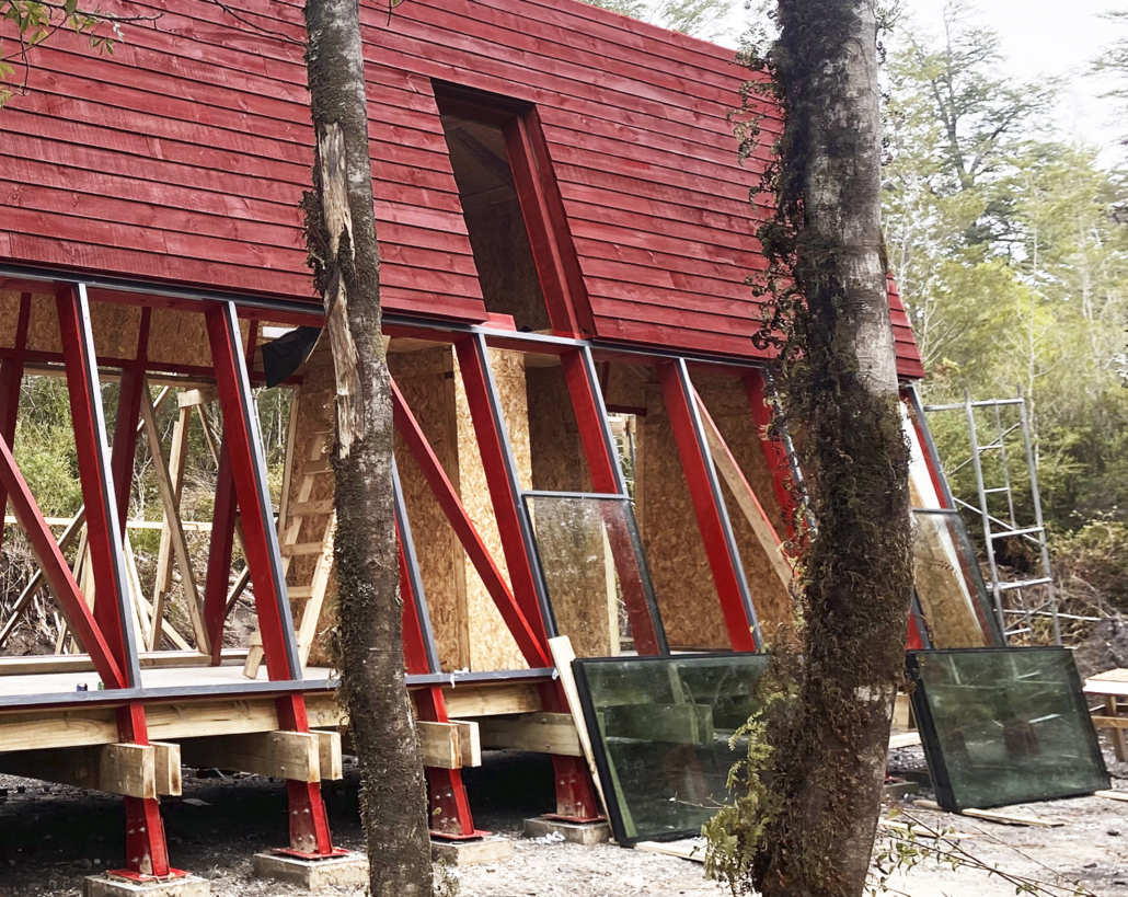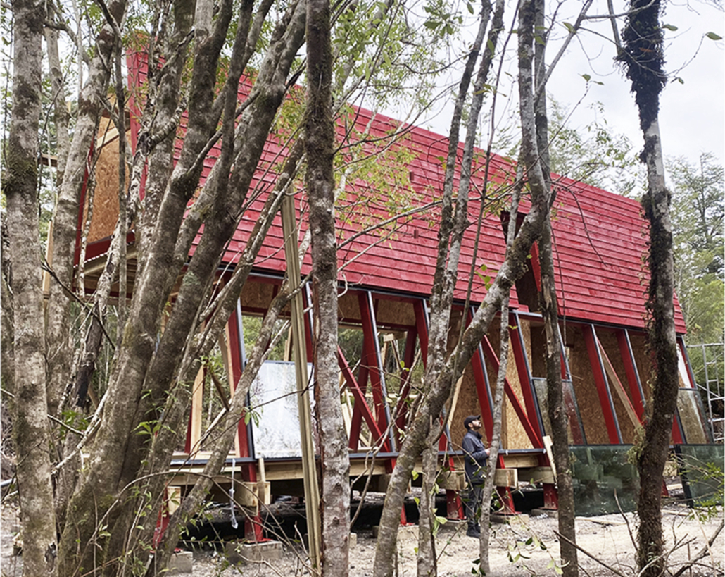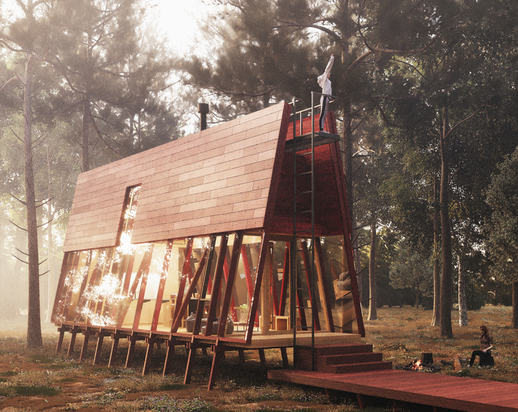 La Guinda es un refugio sencillo y funcional de muros inclinados que se extienden para entregar amplitud espacial. En 40 m2 y un interior de madera, ofrece dos cálidos ambientes y un altillo. Desde el exterior se puede acceder a un hermoso mirador panorámico.